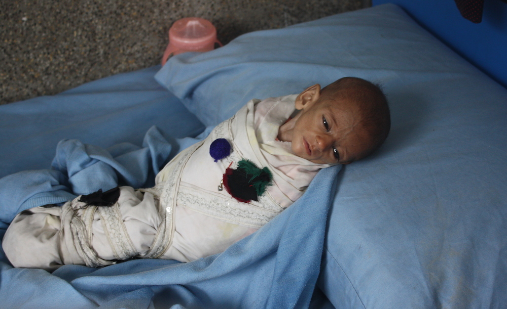 Abdullah’s wails of pain are punctuated only by his rasping cough. His arms bound to his body, he is five months old but weighs just 3.2kg, lighter than some newborns. In the next bed, three-month old Shukoria looks withered and worn, her face wrinkled and pained.
